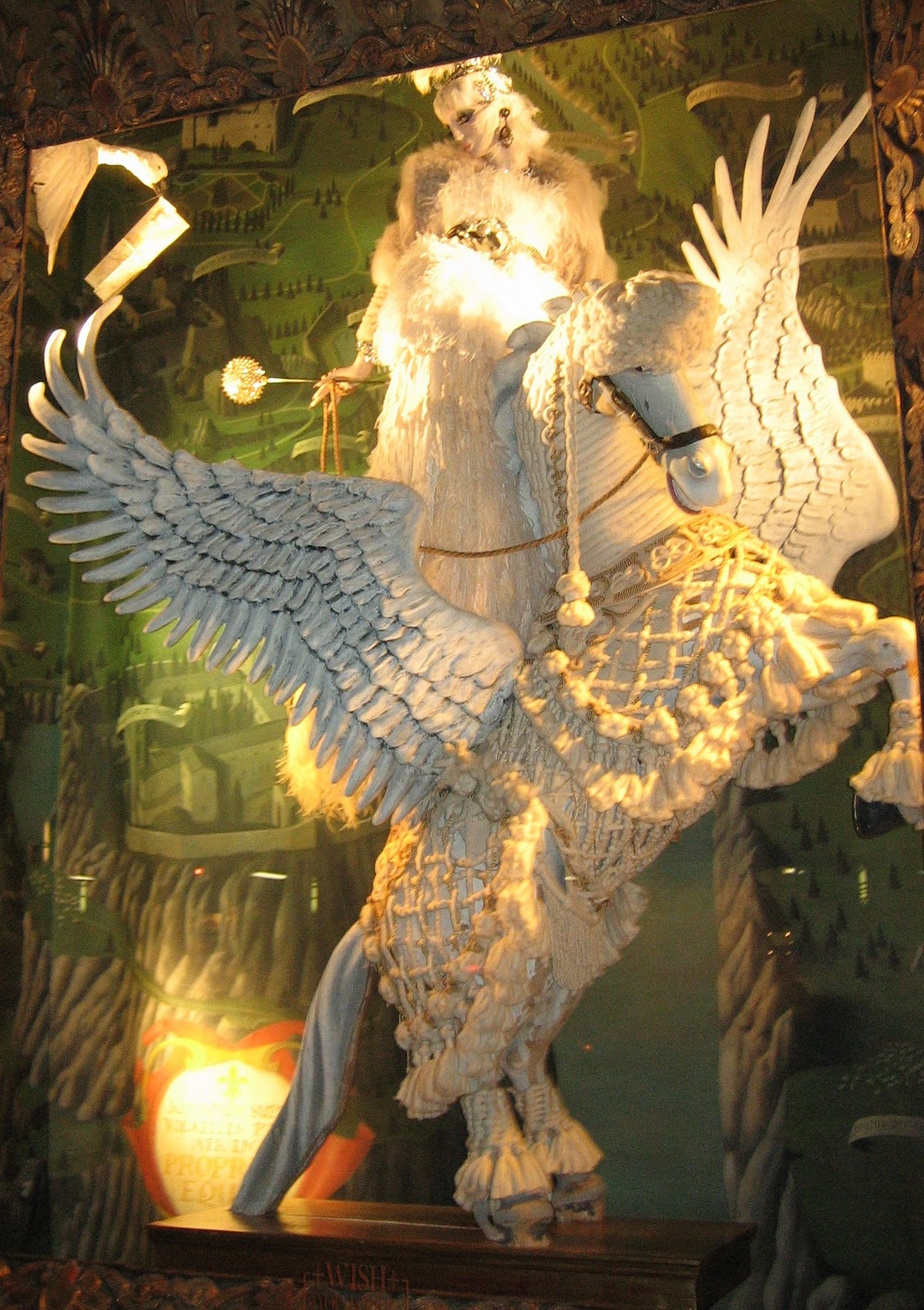 My favorite part of living in New York is being able to experience the Bergdorf Goodman holiday windows in person. Each year, the senior director of visual presentation, David Hoey, and his staff create windows full of pure fantasy and over the top glamour. The theme this season is traveling which includes a winged horse and flying carriage, as well as a silver space ship, listing boat, and scarlet train. You really have to stand in front of them and marvel at all the details. I think my favorite part is the moving backdrop behind the train. It's simply amazing that they can create such splendor in such small spaces. The windows are titled "Wish You Were Here" and I wish all of you were here. For those who can't be, these photos are my holiday gift to you! Enjoy!